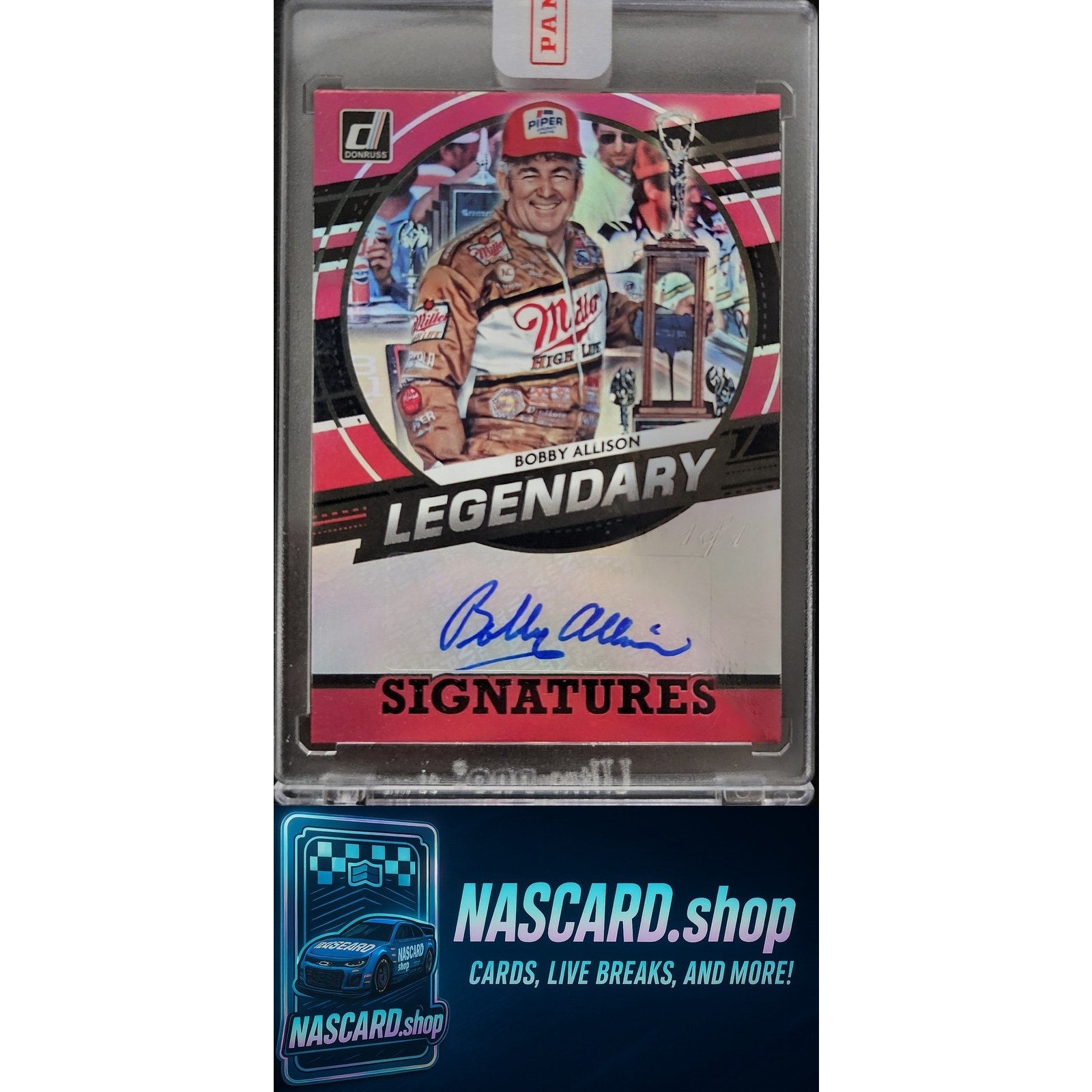 This is a nice example of a 2022 Donruss #LS-BA Bobby Allison Legendary Signatures Holo Black