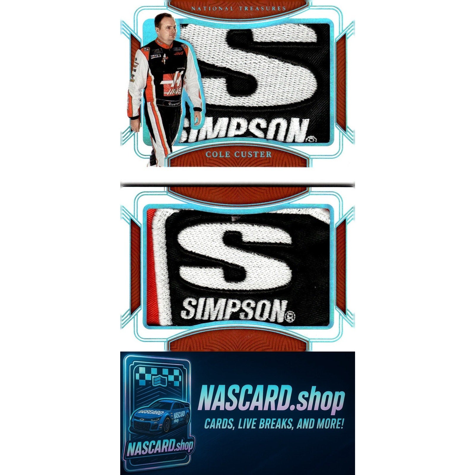 This is a nice example of a 2023 Panini National Treasures #CC Cole Custer Jumbo Firesuit Patch Booklet Dual Associate Sponsors