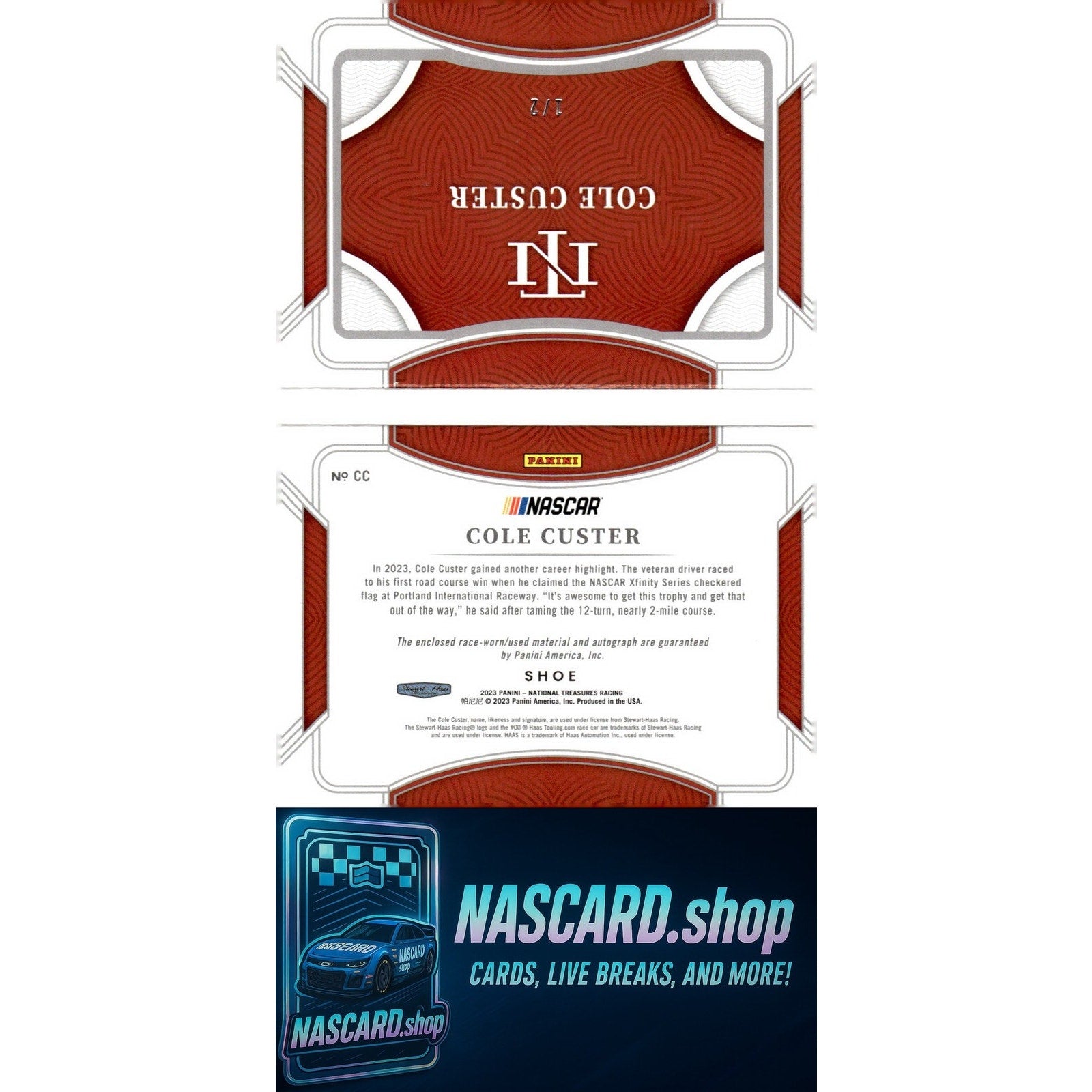 This is a nice example of a 2023 Panini National Treasures #CC Cole Custer Jumbo Shoe Strap Signature Booklet