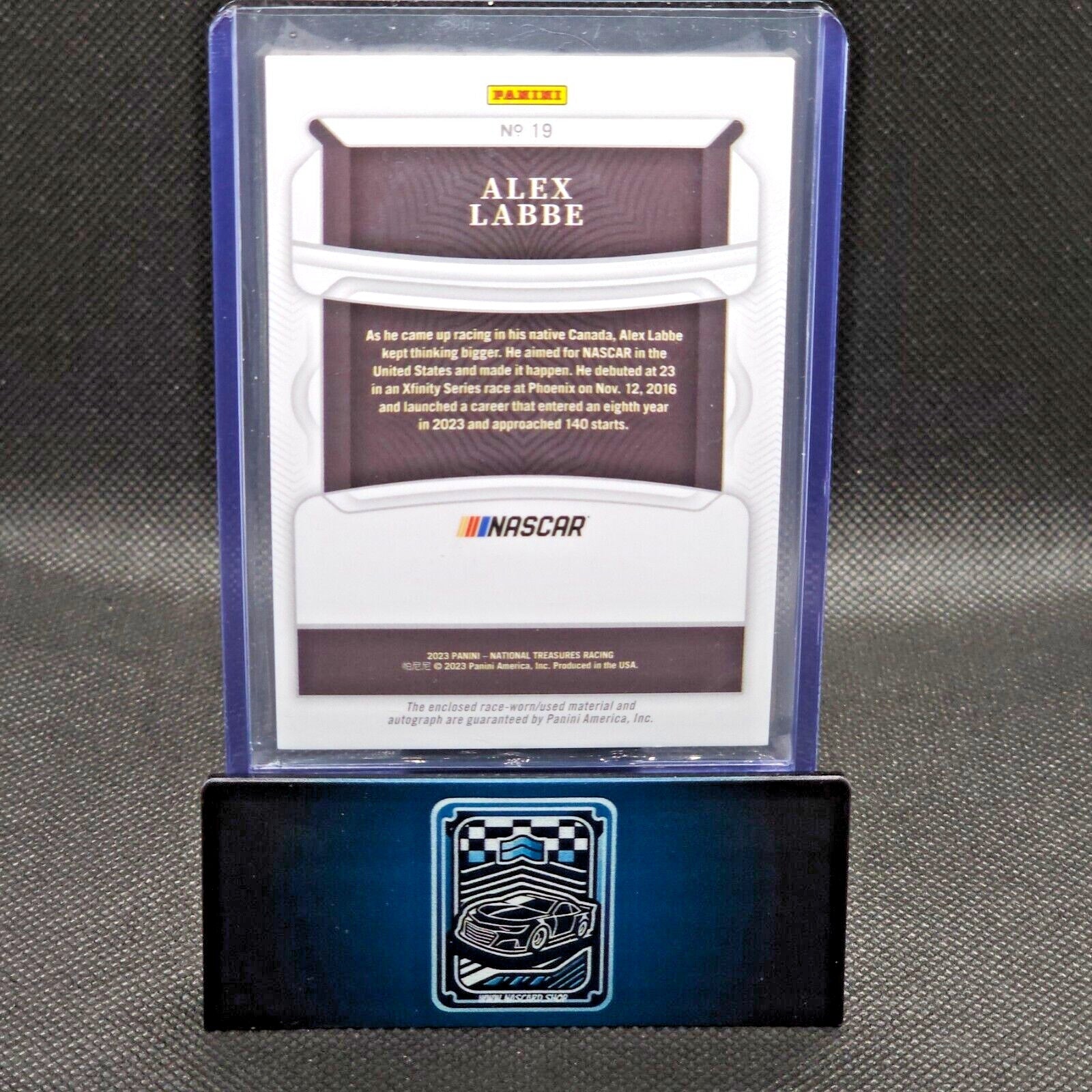 This 2023 Panini National Treasures trading card features Alex Labbe, a NASCAR driver, and his signature. The card is part of the Colossal Materials insert set and is numbered 21 out of 49. It also includes a holographic silver design and a piece of memorabilia. The card is in standard size and is in English language. The autograph authenticity is done by Panini Authentic and the card is made in the United States. This card is a must-have for any auto racing fan or collector. Get your hands on this rare and unique card that showcases the talent of Alex Labbe.