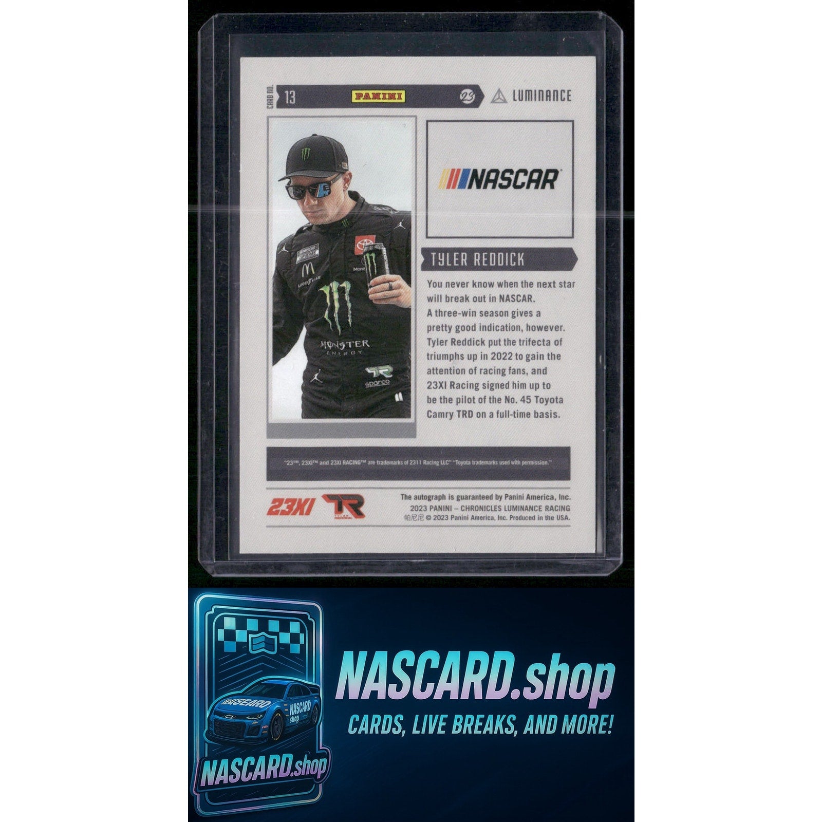 This is a nice example of a 2023 Panini Chronicles #13 Tyler Reddick Luminance Autographs