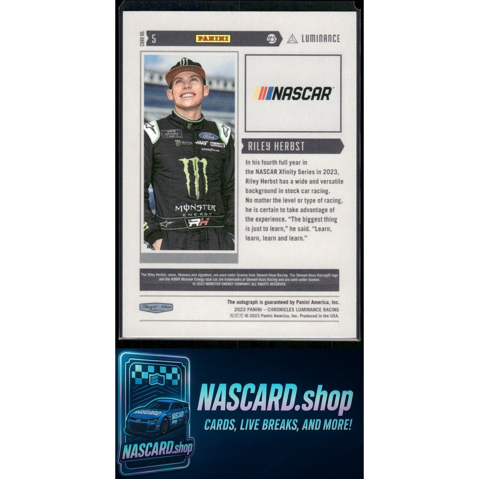 This is a nice example of a 2023 Panini Chronicles #5 Riley Herbst Luminance Autographs