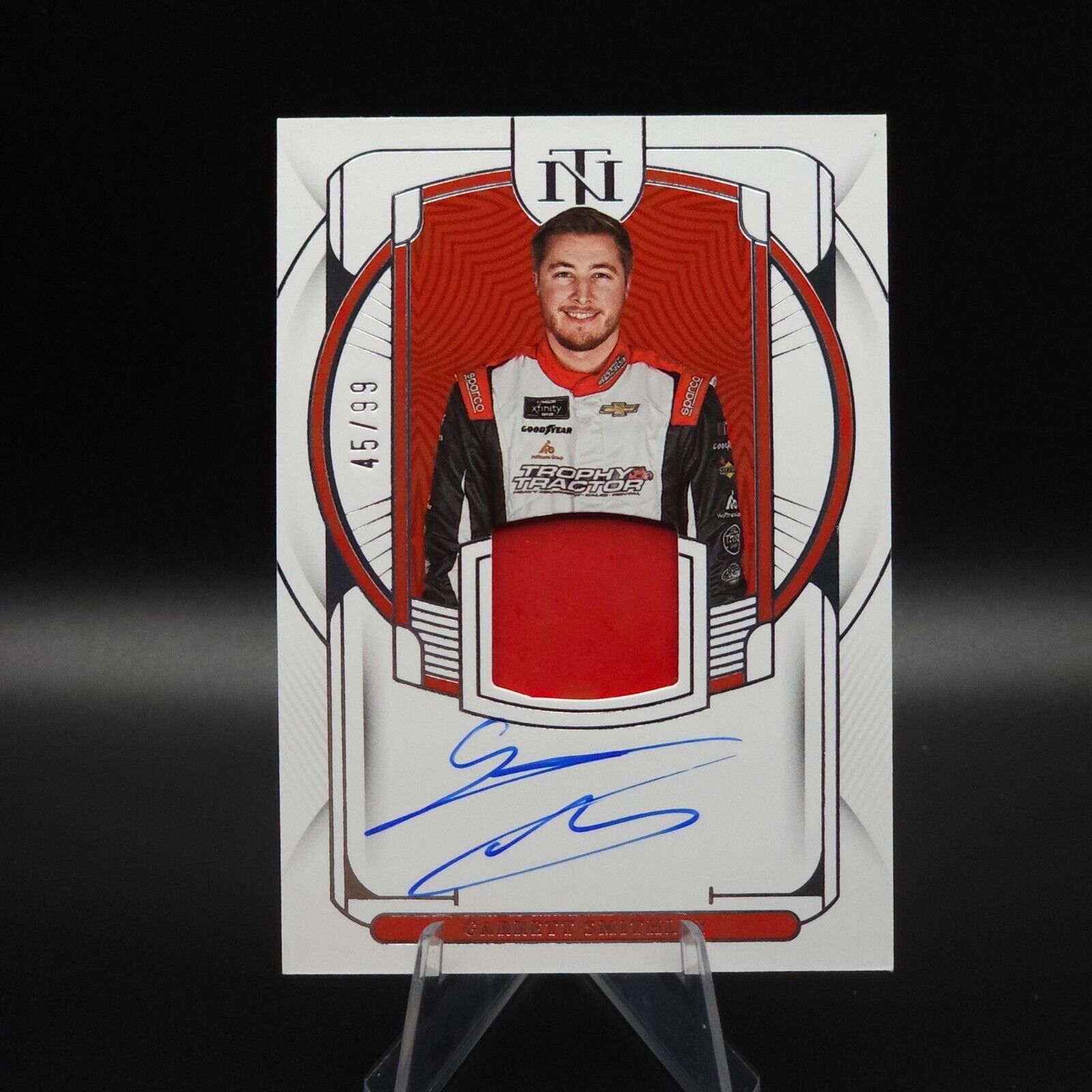 The product is a 2023 Panini National Treasures trading card featuring a sheet metal signature of NASCAR driver Garrett Smithley. The card is autographed and serial numbered out of 99 copies. It is part of the Sheet Metal Signatures insert set and was signed in hard format by Garrett Smithley himself. Produced by Panini, this card showcases a unique metal material and is authenticated by Panini Authentic.