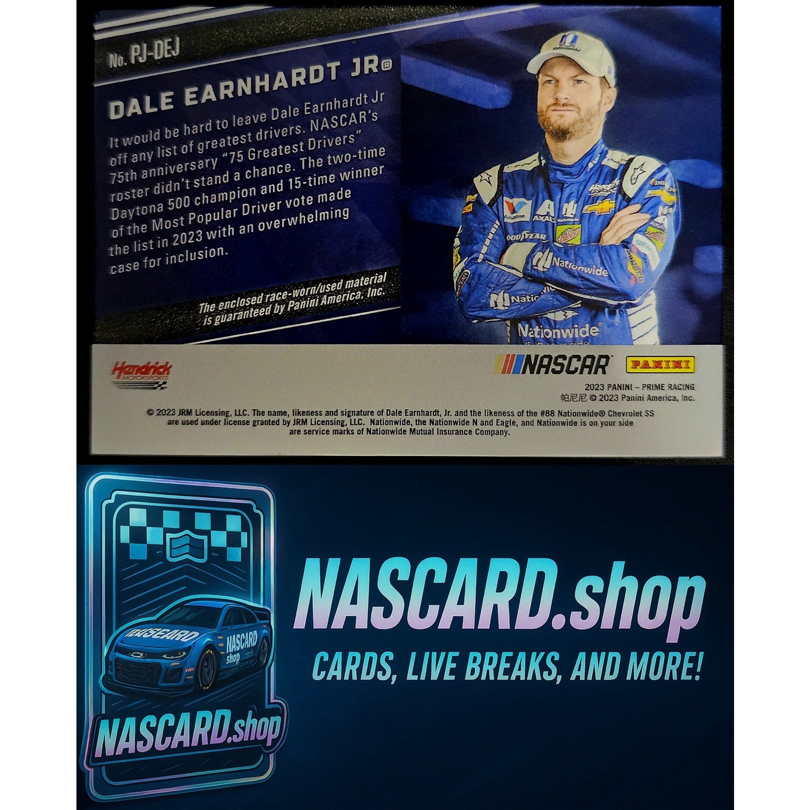 This is a nice example of a 2023 Panini Prime #PJ-DEJ Dale Earnhardt Jr Prime Jumbo Associate Sponsor