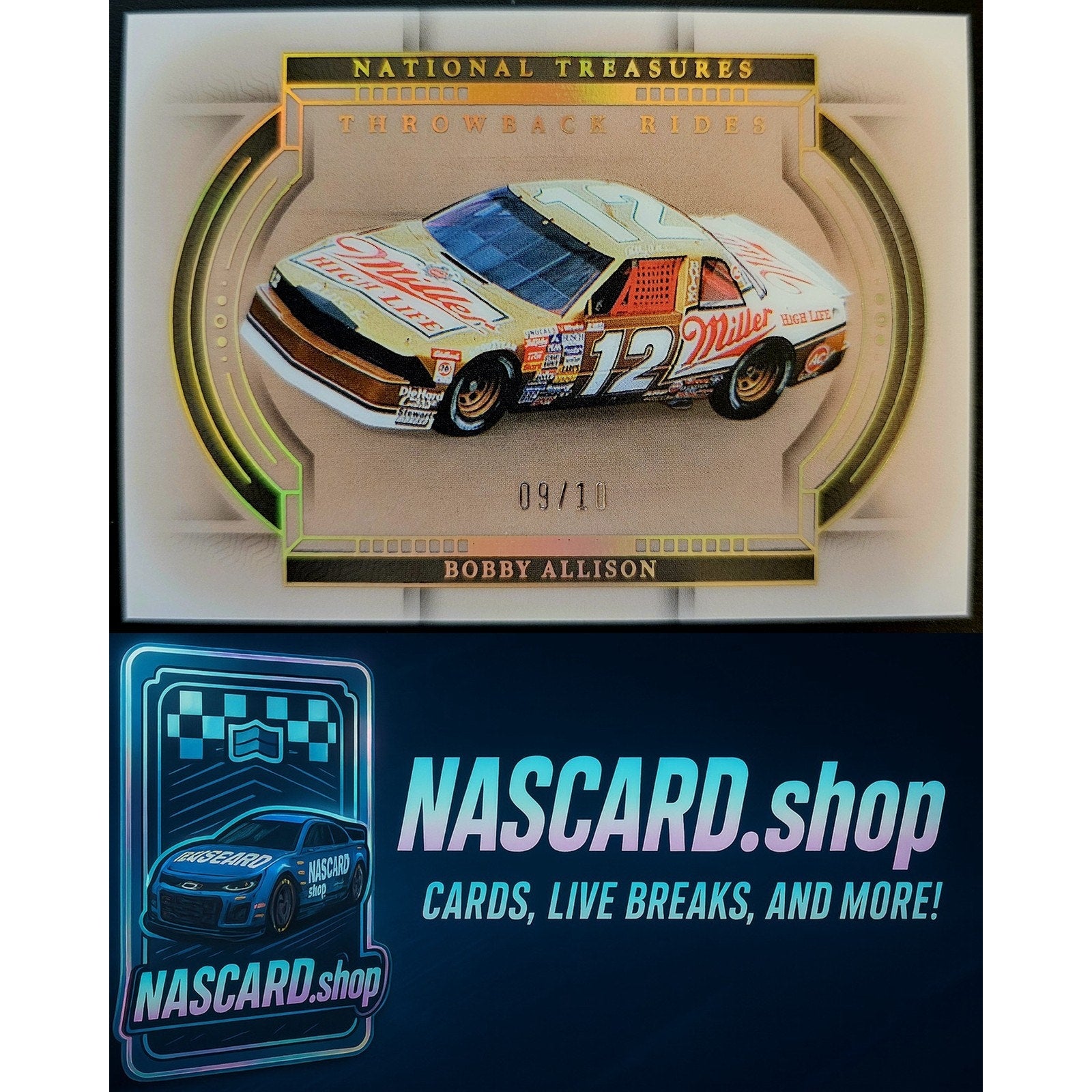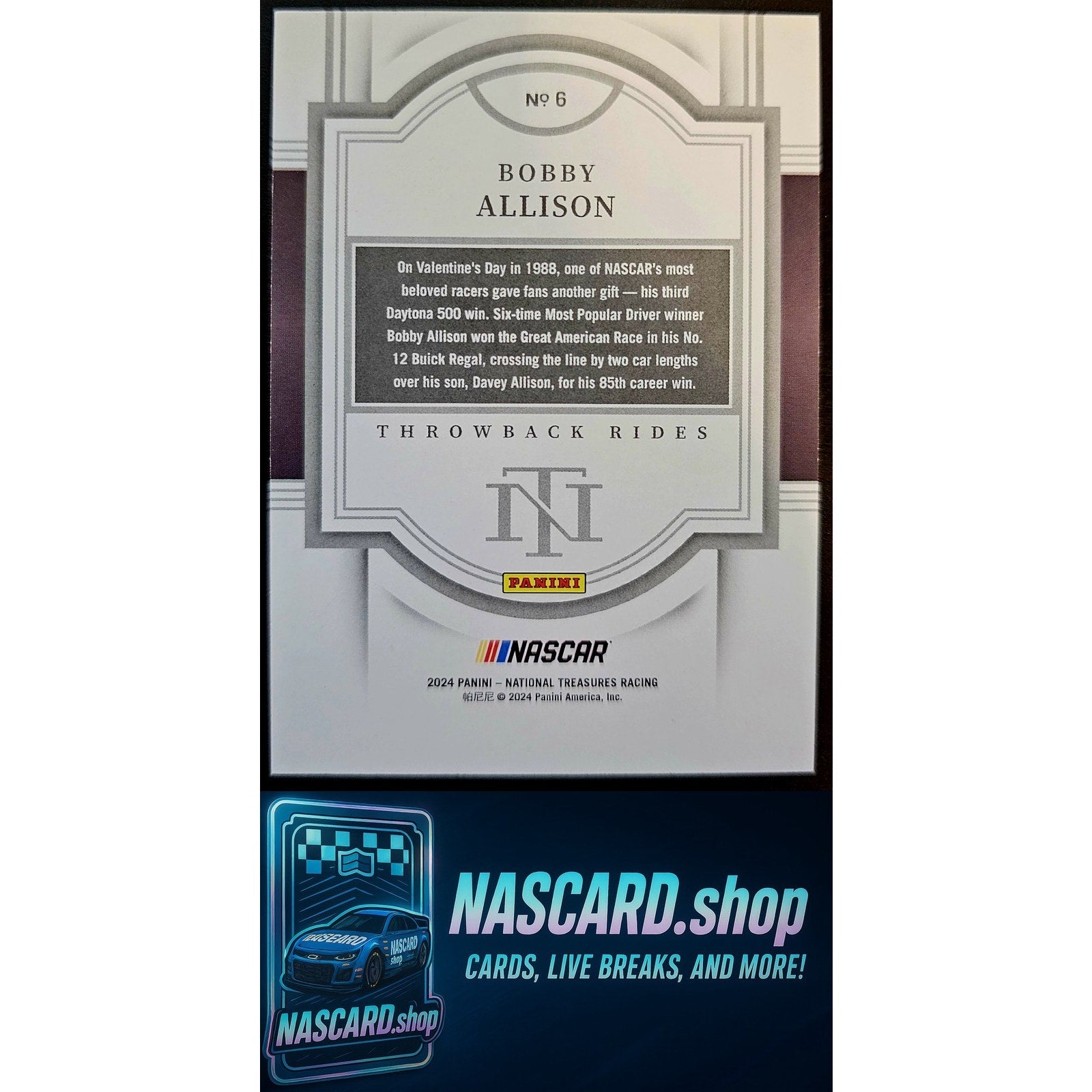 This is a nice example of a 2024 Panini National Treasures #6 Bobby Allison Throwback Rides Gold Holo