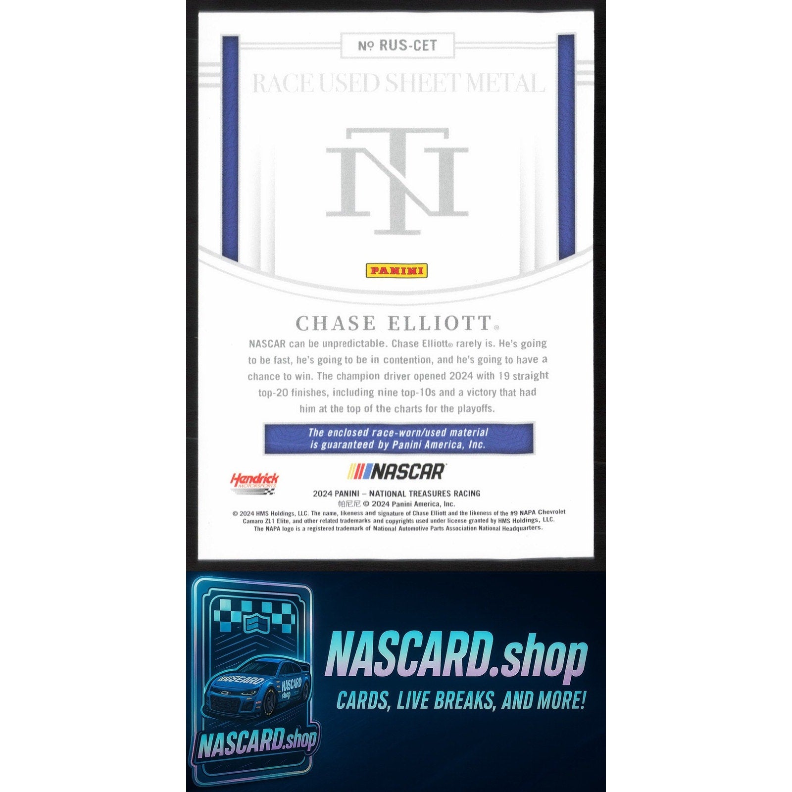 This is a nice example of a 2024 Panini National Treasures #RUS-CET Chase Elliott Race Used Sheet Metal Blue