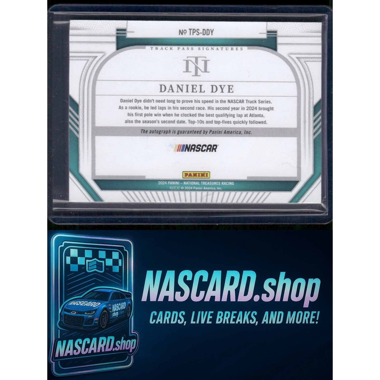 This is a nice example of a 2024 Panini National Treasures #TPS-DDY Daniel Dye Track Pass Signatures Holo Silver