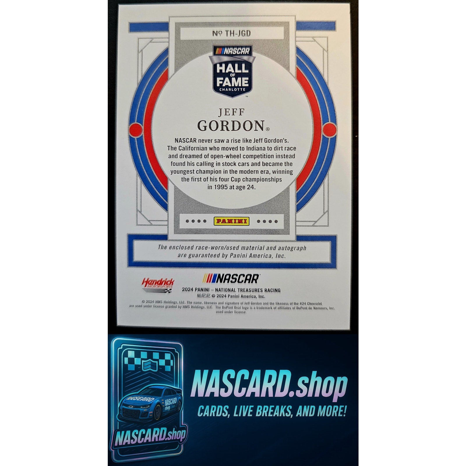 This is a nice example of a 2024 Panini National Treasures #TH-JGD Jeff Gordon Treasures Of The Hall Holo Gold