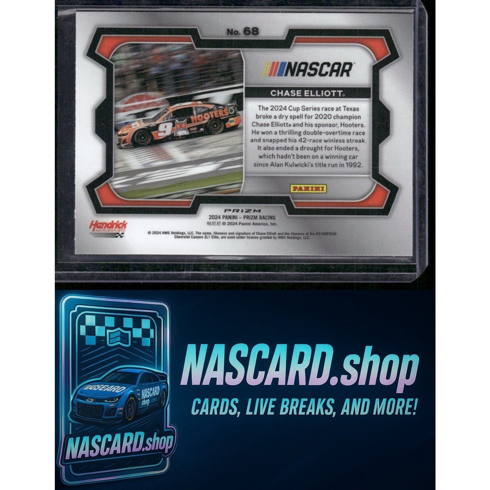 This is a nice example of a 2024 Panini Prizm #68 Chase Elliott White Sparkle