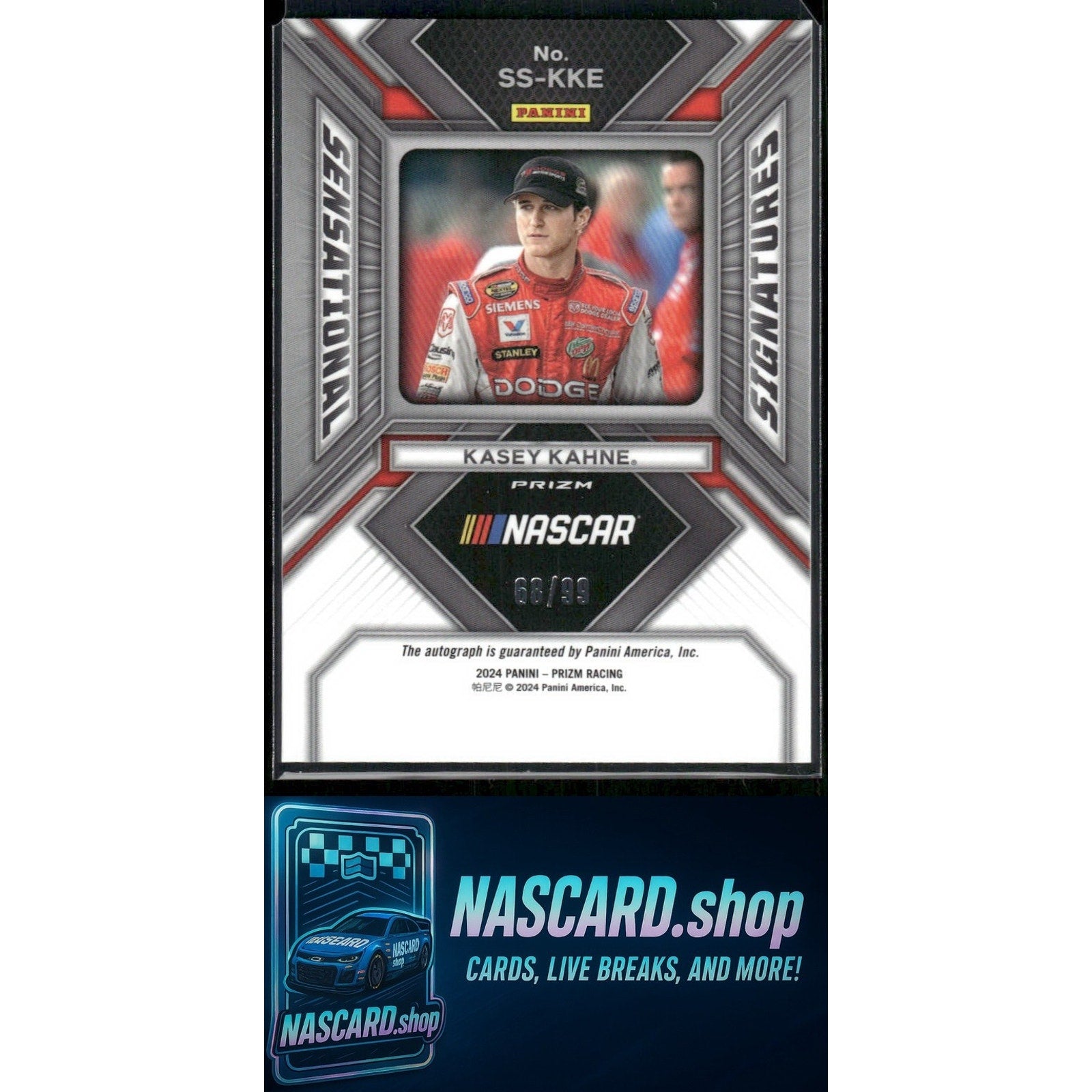 This is a nice example of a 2024 Panini Prizm #SS-KKE Kasey Kahne Sensational Signatures Red