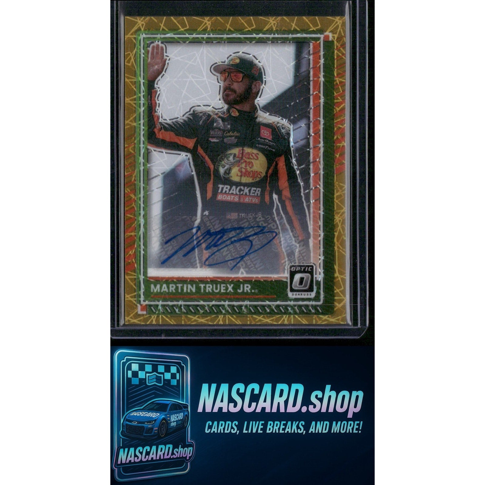This is a nice example of a 2025 Donruss #61 Martin Truex Jr. Optic Signatures Gold Velocity