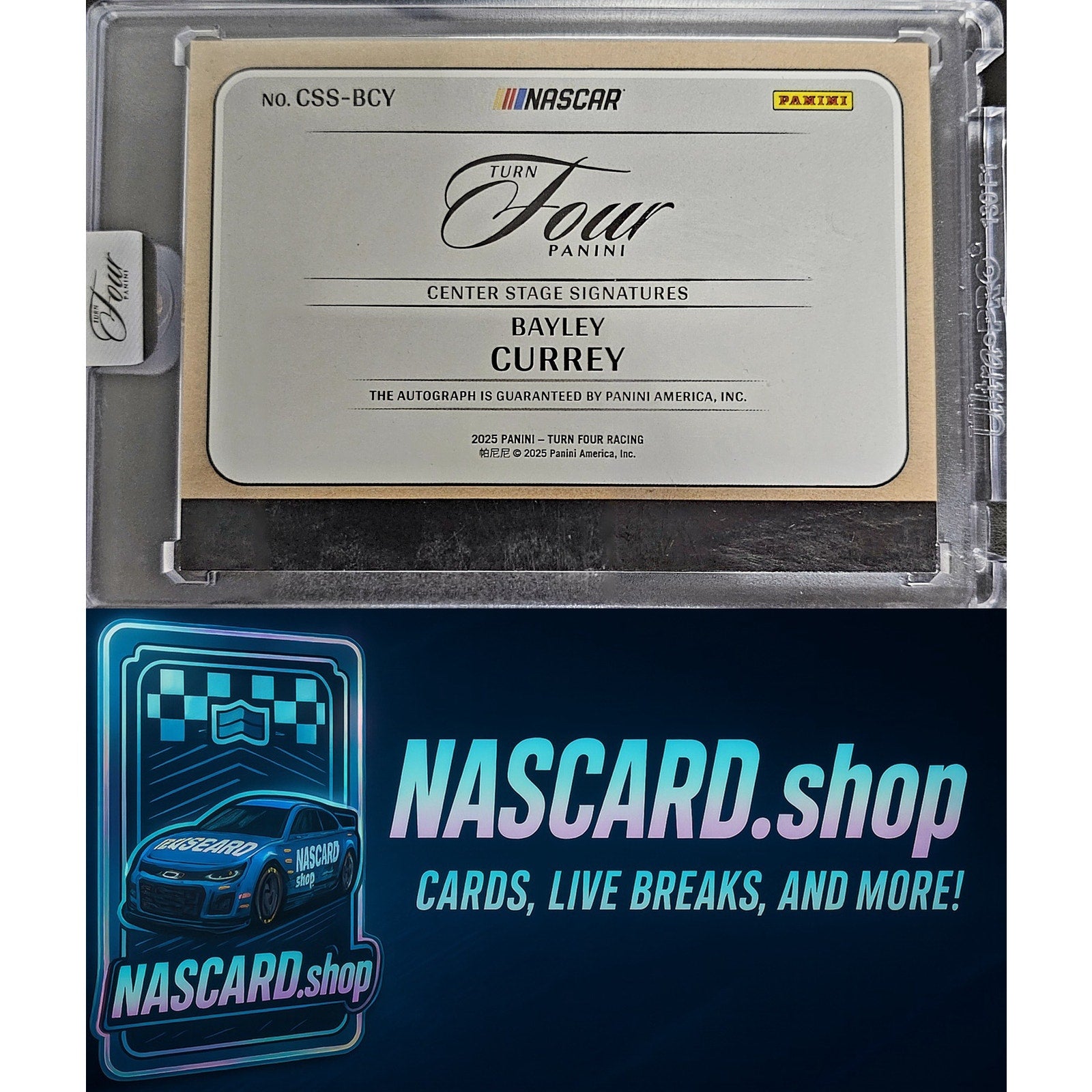 This is a nice example of a 2025 Panini Turn Four #CSS-BCY Bayley Currey Center Stage Signatures Holo Silver