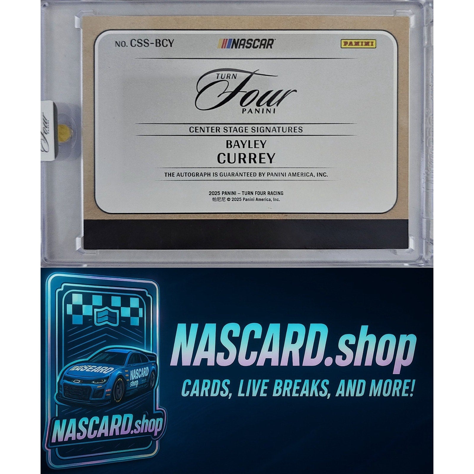 This is a nice example of a 2025 Panini Turn Four #CSS-BCY Bayley Currey Center Stage Signatures Red