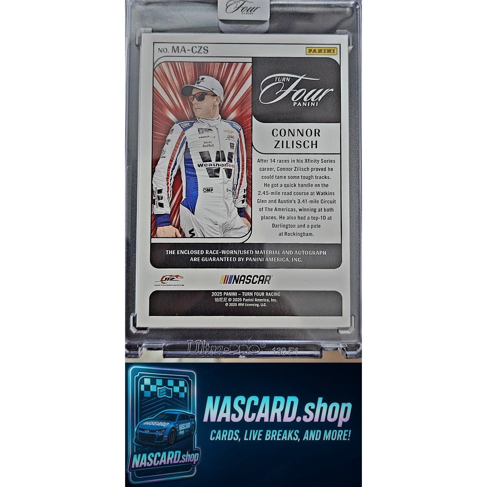 This is a nice example of a 2025 Panini Turn Four #MA-CZS Connor Zilisch Memorabilia Autographs