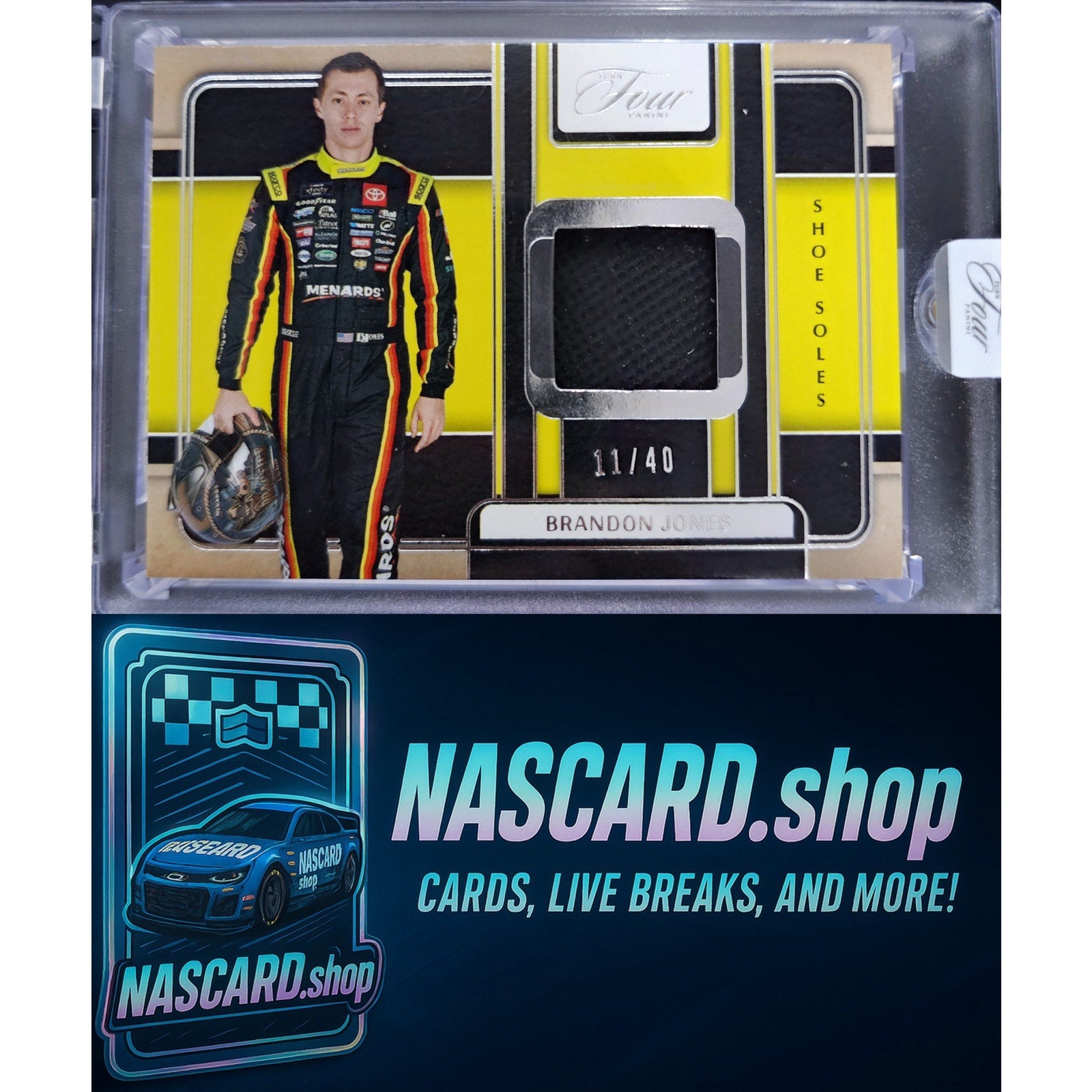 This is a nice example of a 2025 Panini Turn Four #SS-BJN Brandon Jones Shoe Soles #/40